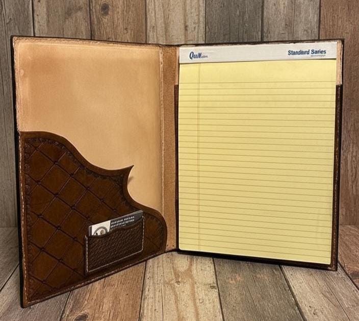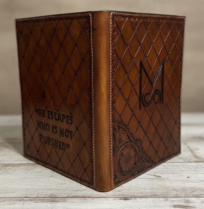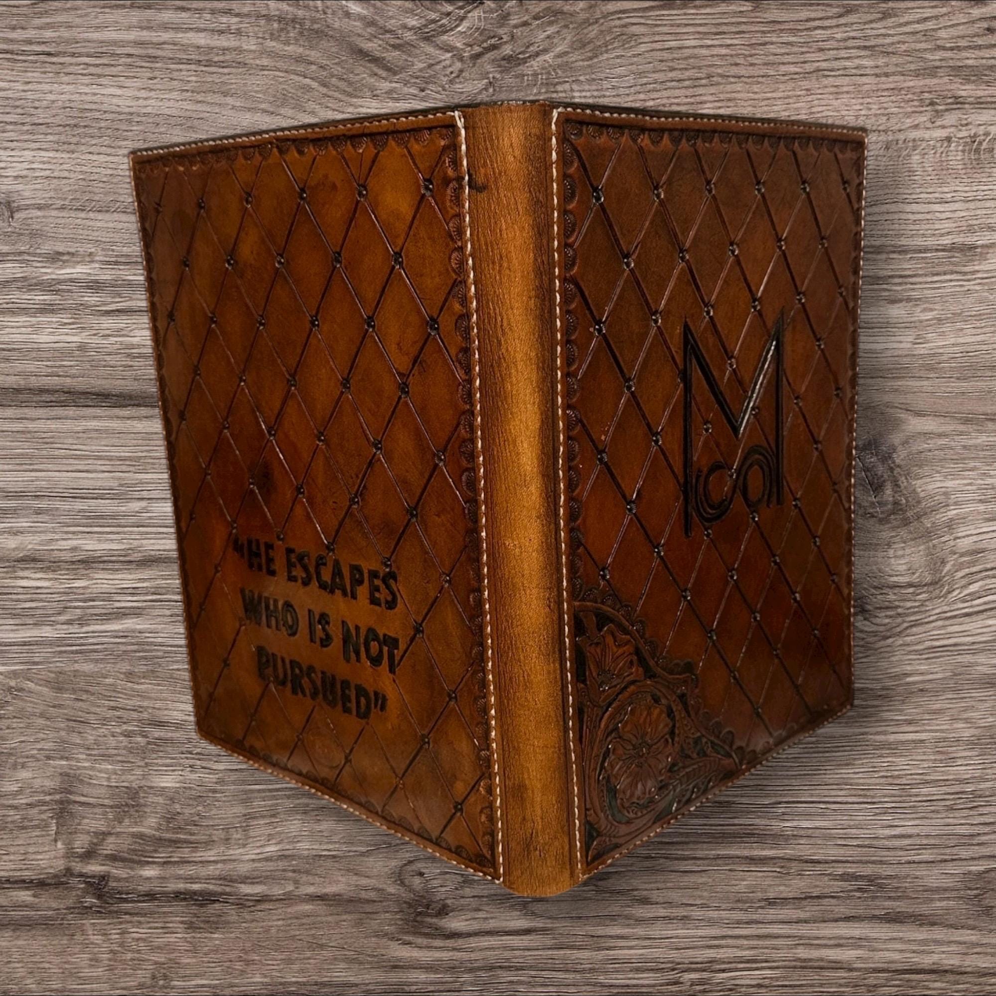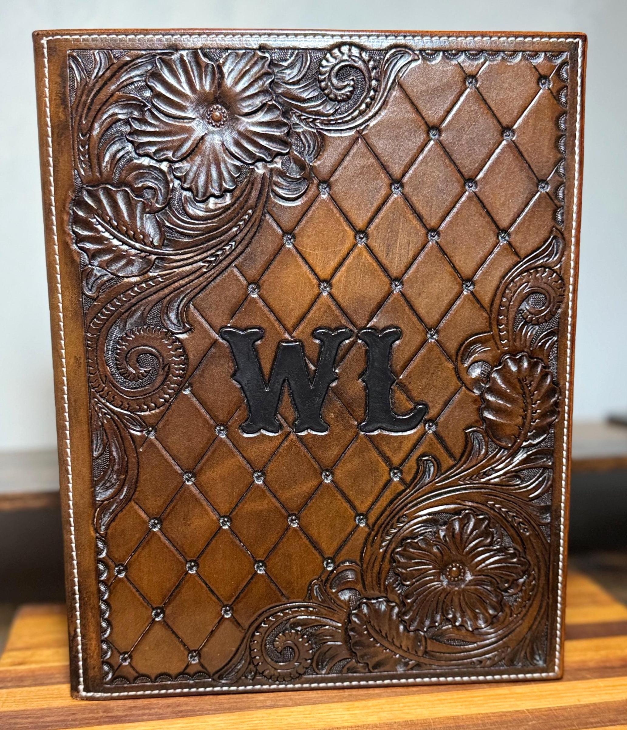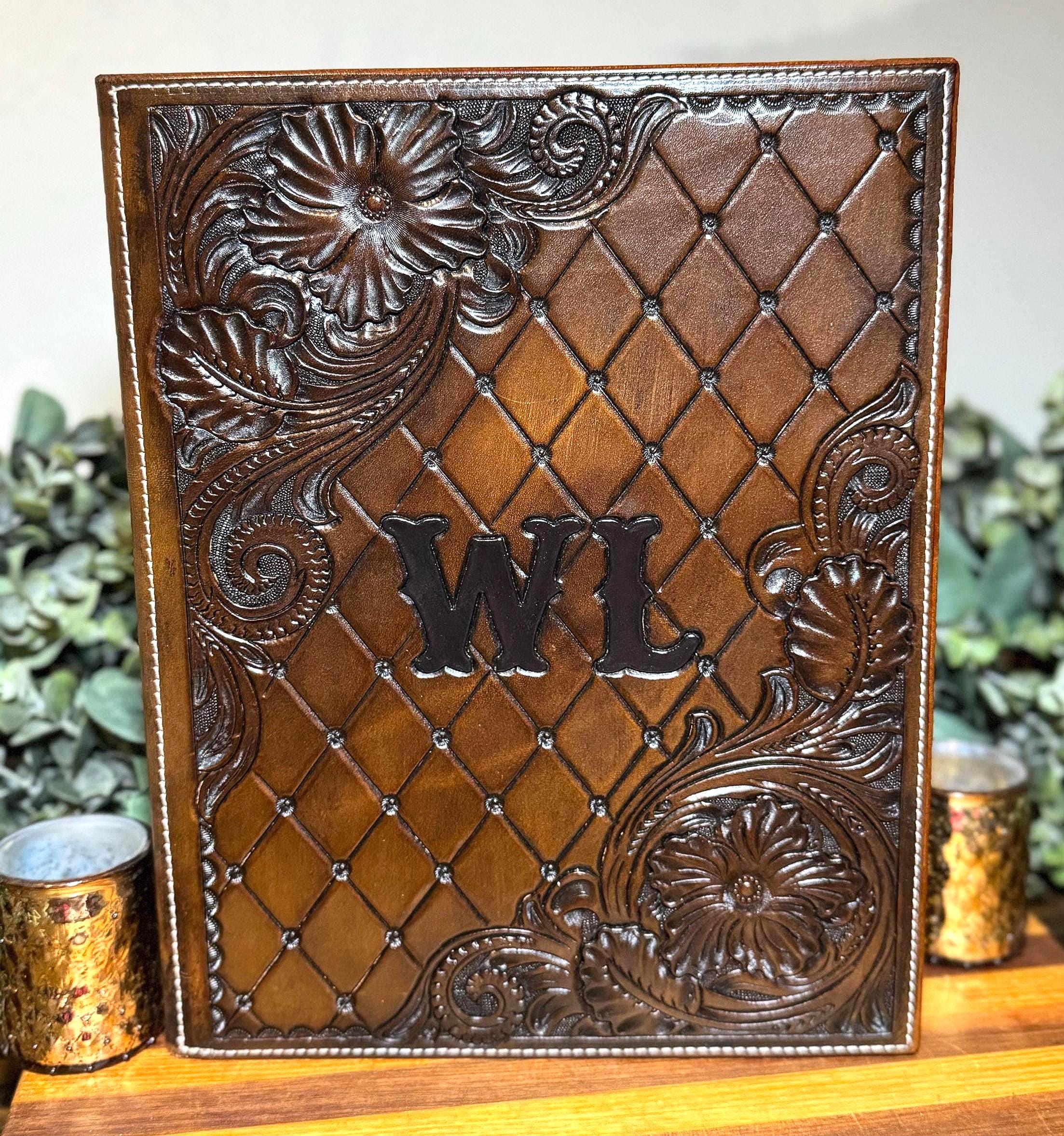 Discover the perfect blend of craftsmanship and individuality with our Custom Handmade Tooled Leather Padfolios and Journal Covers. Each piece is handcrafted from premium leather, featuring elegant tooling designs that make every item truly one-of-a-kind. Personalize your cover with your name or initials in any color you desire, and choose from our selection of thread colors. This allows you to create a padfolio or journal cover that is uniquely yours and perfectly suited to your personal style.