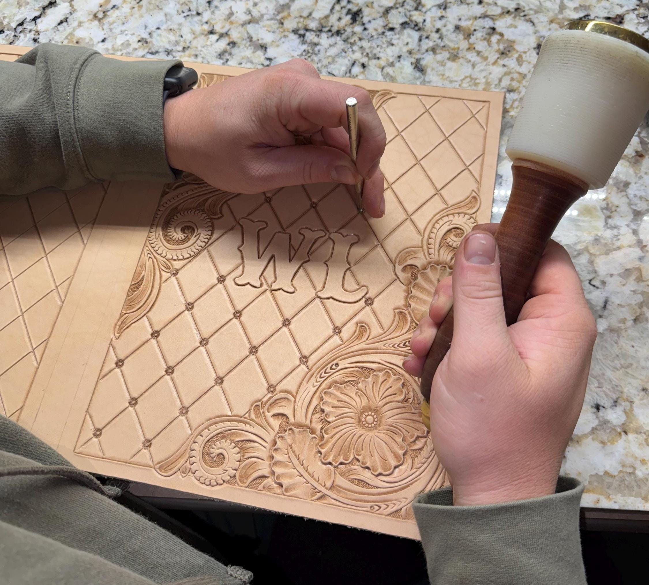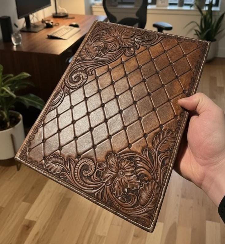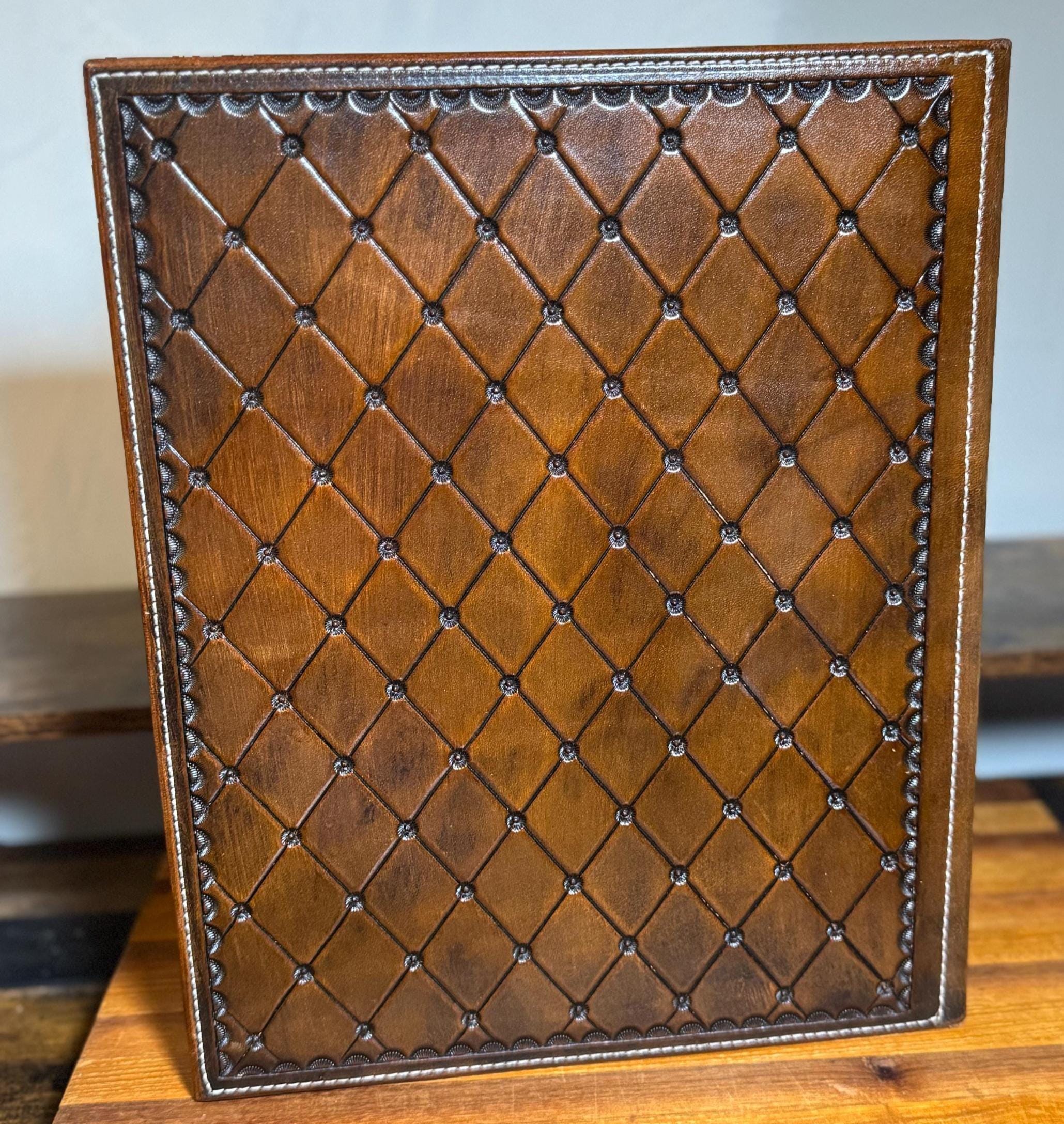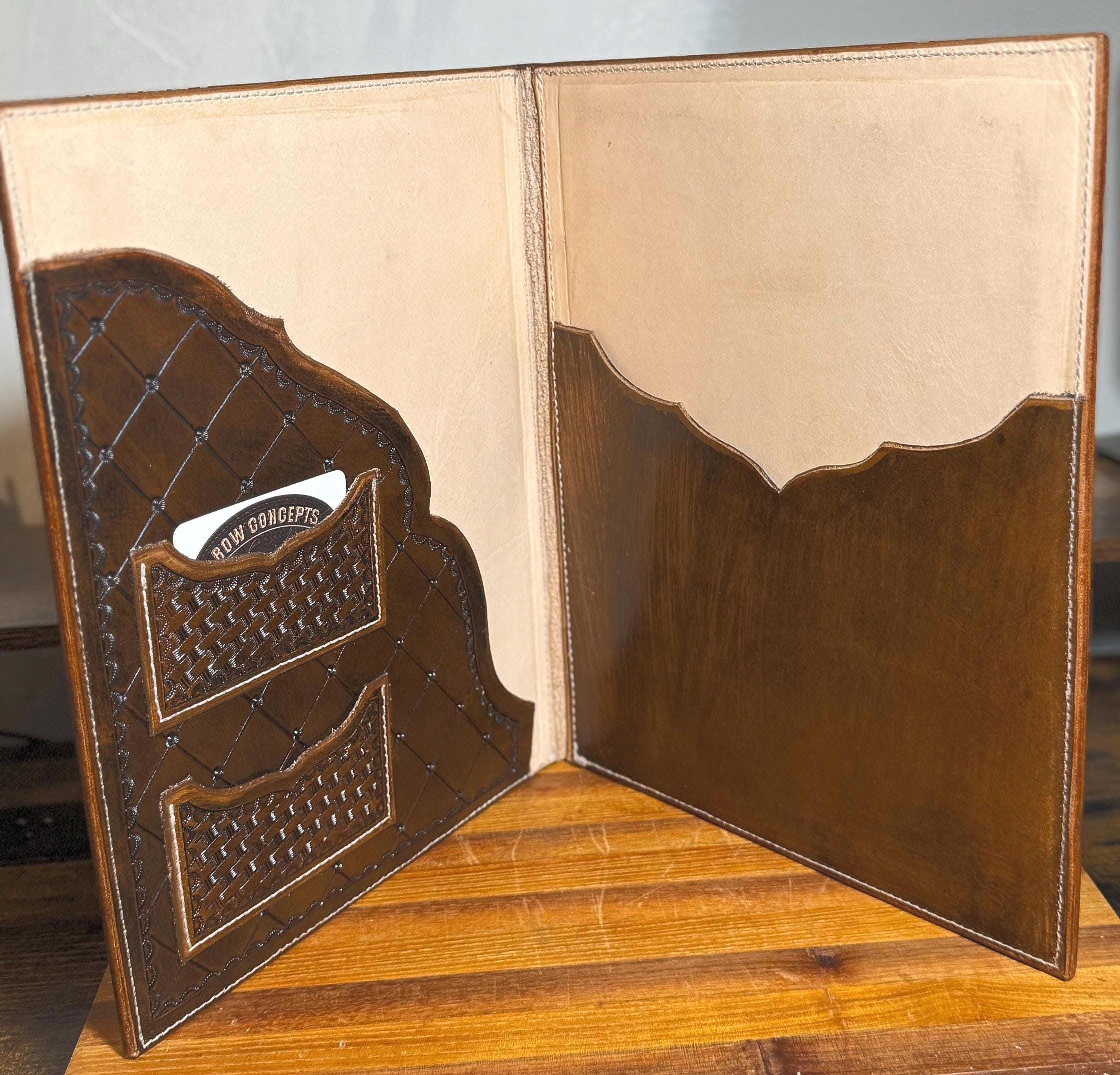 Discover the perfect blend of craftsmanship and individuality with our Custom Handmade Tooled Leather Padfolios and Journal Covers. Each piece is handcrafted from premium leather, featuring elegant tooling designs that make every item truly one-of-a-kind. Personalize your cover with your name or initials in any color you desire, and choose from our selection of thread colors. This allows you to create a padfolio or journal cover that is uniquely yours and perfectly suited to your personal style.