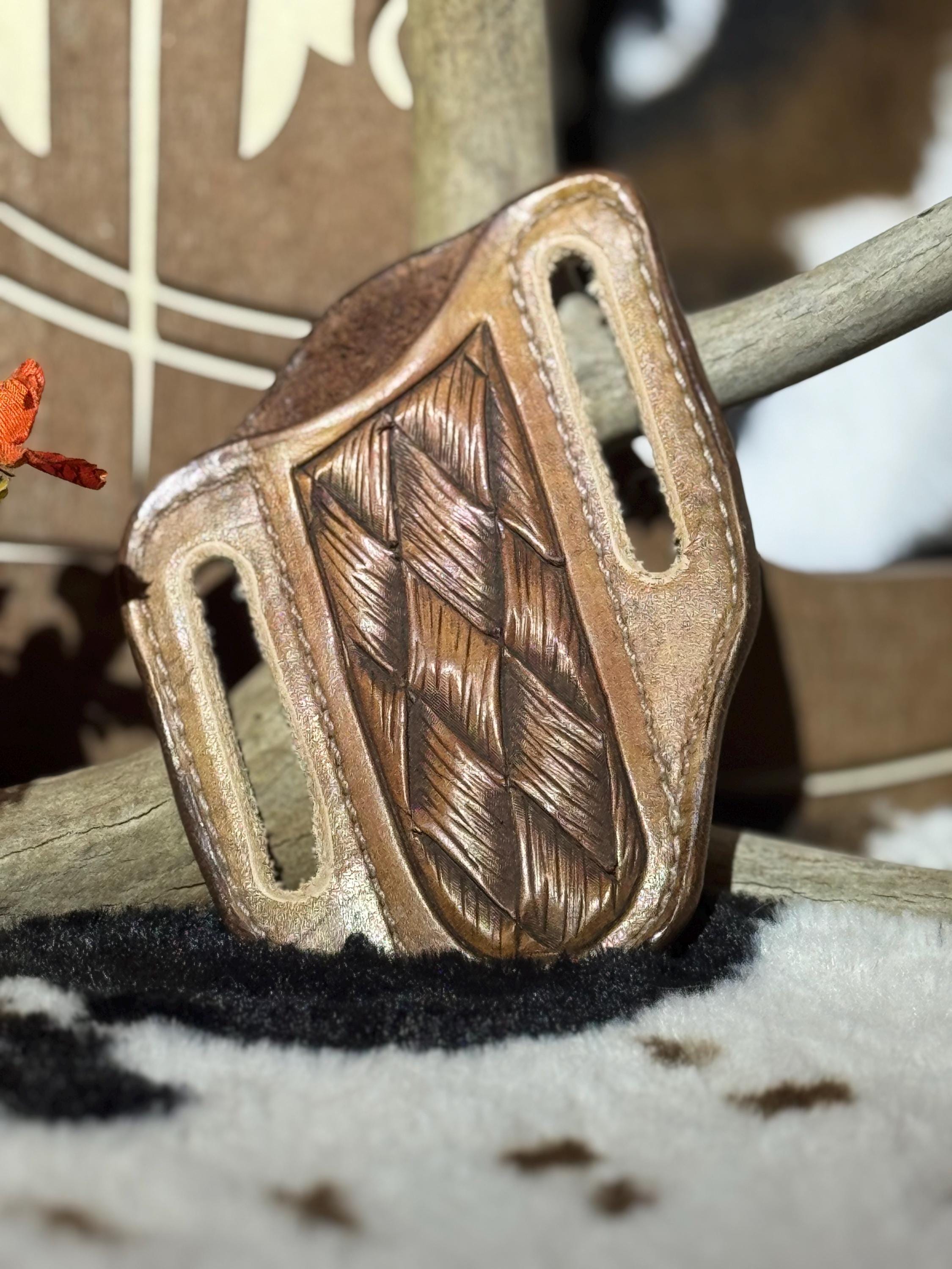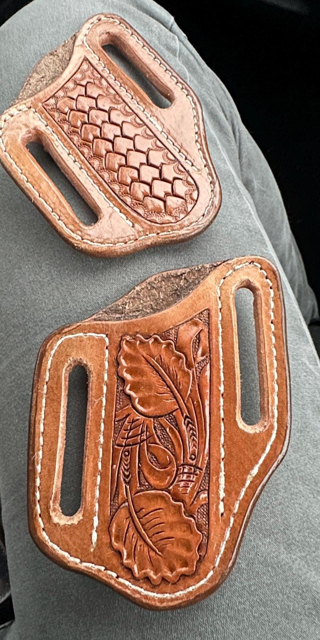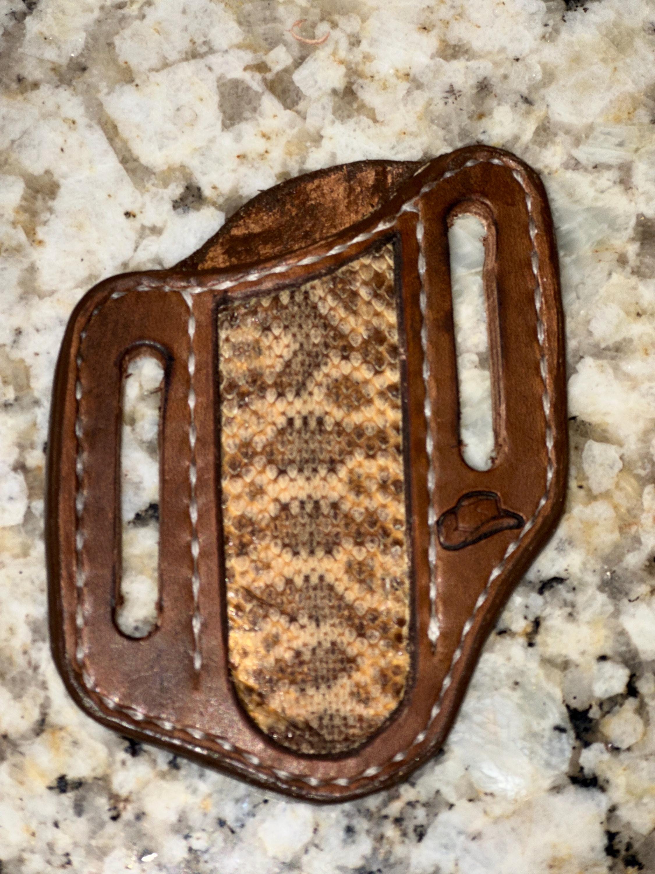 This is a hand crafted leather knife sheath. These have grown very popular over time and are perfect gifts! These sheaths are designed for the Case 2 blade Trapper pocket knife or similar knives. These sheaths are commonly worn on the back of a belt are are designed to fit up to an 1.75 belt.