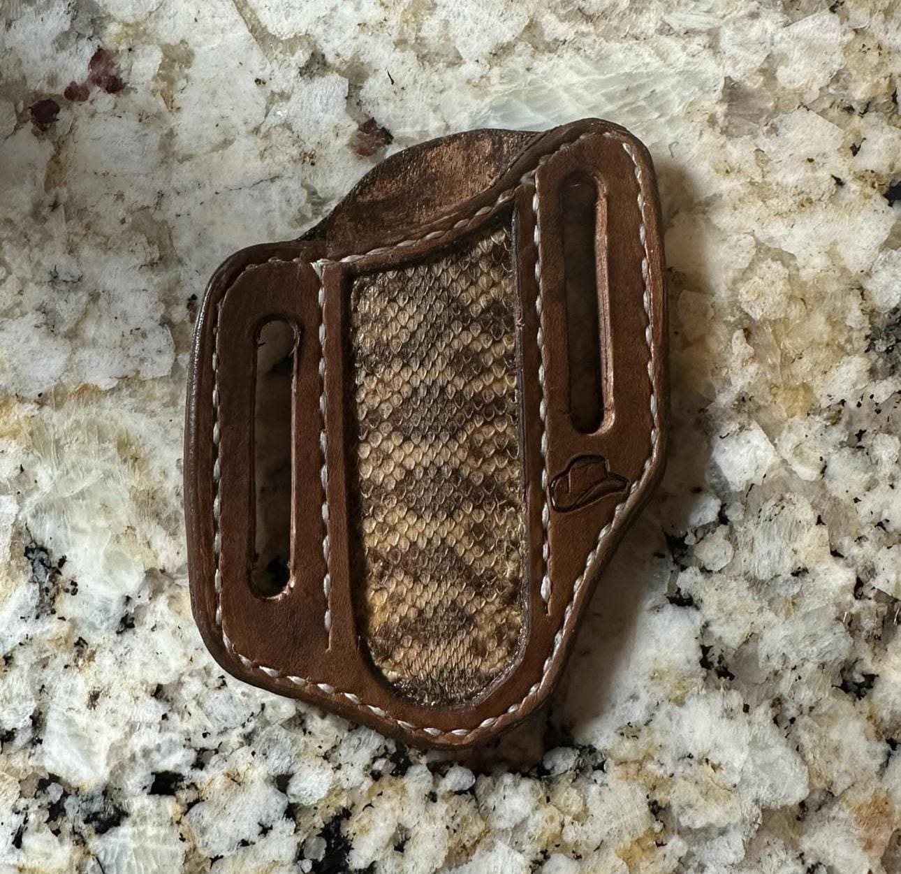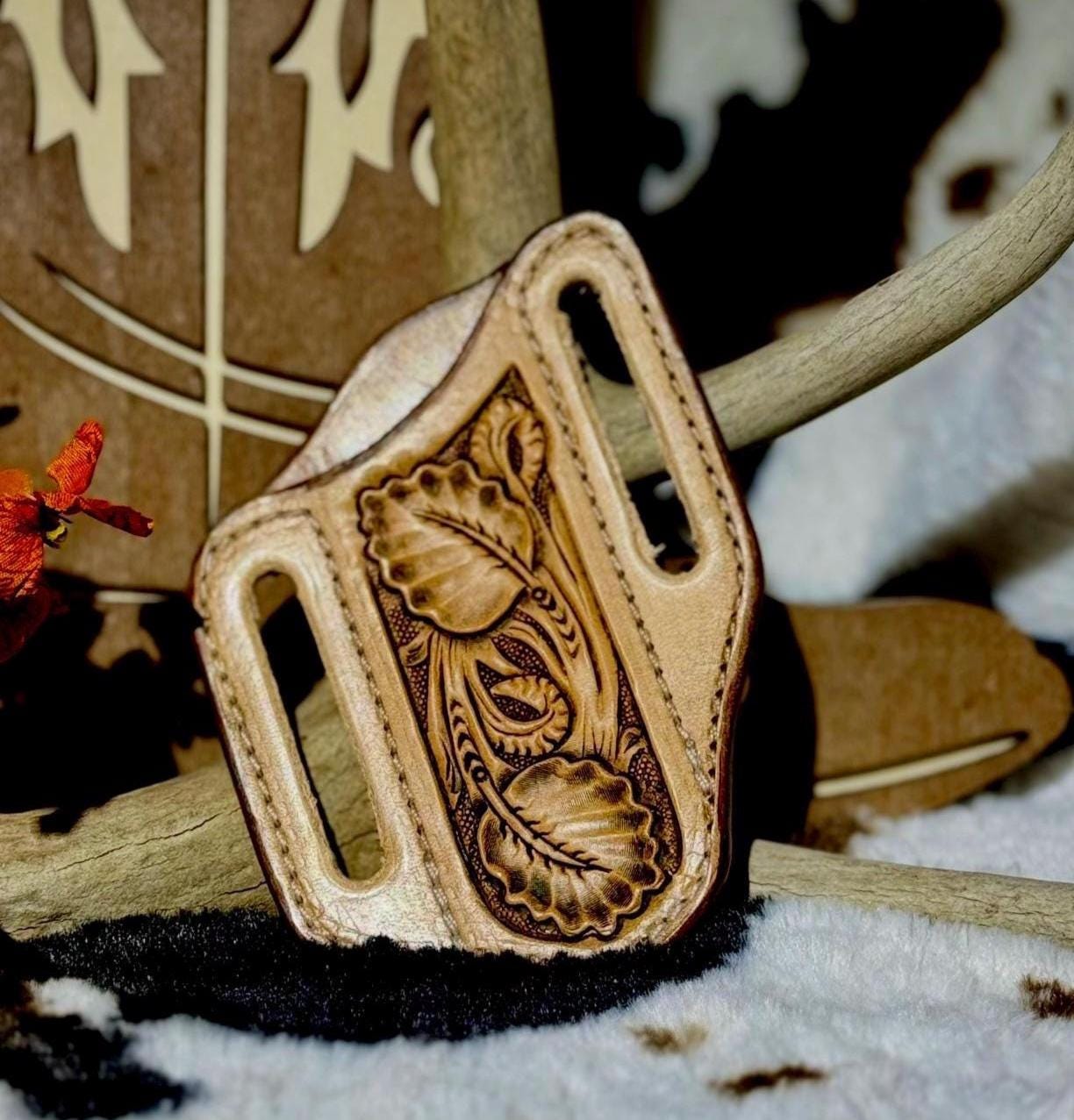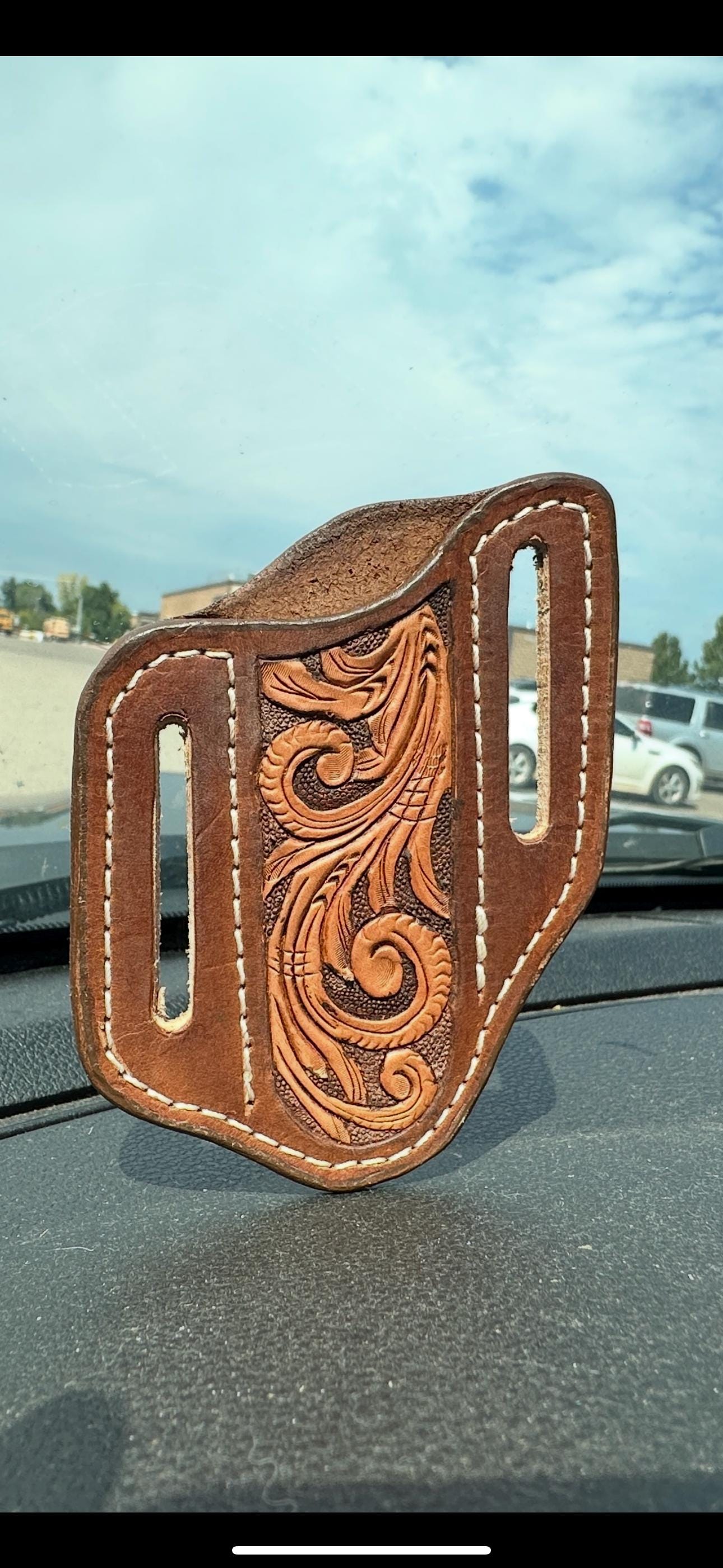 This is a hand crafted leather knife sheath. These have grown very popular over time and are perfect gifts! These sheaths are designed for the Case 2 blade Trapper pocket knife or similar knives. These sheaths are commonly worn on the back of a belt are are designed to fit up to an 1.75 belt.